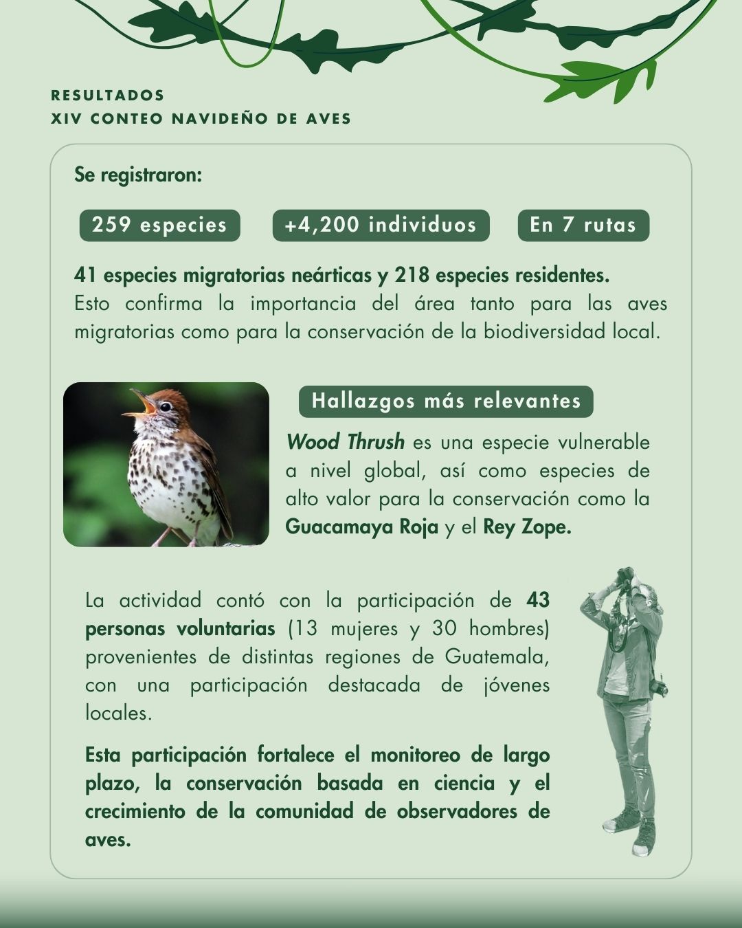 El XIV Conteo Navideño de Aves fue organizado por el Consejo Nacional de Áreas Protegidas (CONAP), a través de la Dirección Regional Petén, Wildlife Conservation Society (WCS), la Asociación Balam, la Estación Biológica Las Guacamayas, la Petén Birders Association y el Caoba Birders Club. La actividad contó con el apoyo de la Municipalidad de San Andrés, Petén; el Fondo de Paisajes Biodiversos (BLF, por sus siglas en inglés); AgroAmérica; y NaturAceites.